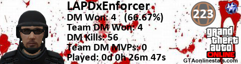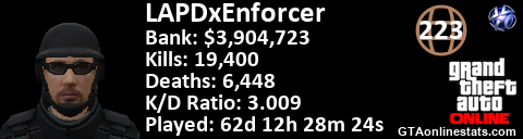 [URL=http://GTAonlinestats.com/showplayer/LAPDxEnforcer][IMG]http://GTAonlinestats.com/dmsignature/LAPDxEnforcer/sig.png[/IMG][/URL]