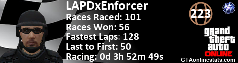 <a href="http://GTAonlinestats.com/showplayer/LAPDxEnforcer"><img src="http://GTAonlinestats.com/racesignature/LAPDxEnforcer/sig.png" alt="LAPDxEnforcer" border="0" /></a>