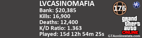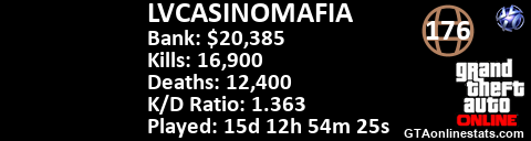 [URL=http://GTAonlinestats.com/showplayer/LVCASINOMAFIA][IMG]http://GTAonlinestats.com/dmsignature/LVCASINOMAFIA/sig.png[/IMG][/URL]