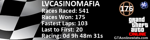 [URL=http://GTAonlinestats.com/showplayer/LVCASINOMAFIA][IMG]http://GTAonlinestats.com/racesignature/LVCASINOMAFIA/sig.png[/IMG][/URL]