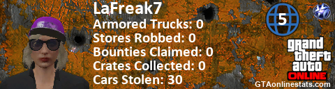 [URL=http://GTAonlinestats.com/showplayer/LaFreak7/2][IMG]http://GTAonlinestats.com/crimesignature/LaFreak7/2/sig.png[/IMG][/URL]