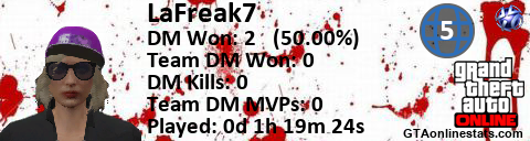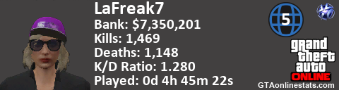 [URL=http://GTAonlinestats.com/showplayer/LaFreak7/2][IMG]http://GTAonlinestats.com/dmsignature/LaFreak7/2/sig.png[/IMG][/URL]