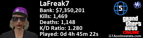 [URL=http://GTAonlinestats.com/showplayer/LaFreak7/2][IMG]http://GTAonlinestats.com/signature/LaFreak7/2/sig.png[/IMG][/URL]
