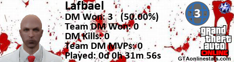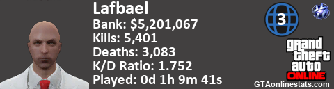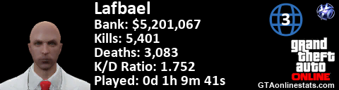 [URL=http://GTAonlinestats.com/showplayer/Lafbael/2][IMG]http://GTAonlinestats.com/signature/Lafbael/2/sig.png[/IMG][/URL]