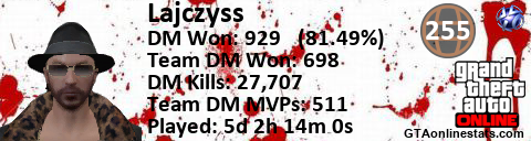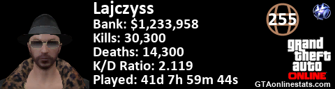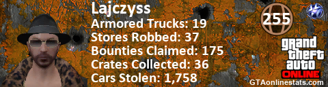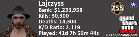 [URL=http://GTAonlinestats.com/showplayer/Lajczyss][IMG]http://GTAonlinestats.com/dmsignature/Lajczyss/sig.png[/IMG][/URL]