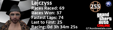 <a href="http://GTAonlinestats.com/showplayer/Lajczyss"><img src="http://GTAonlinestats.com/racesignature/Lajczyss/sig.png" alt="Lajczyss" border="0" /></a>