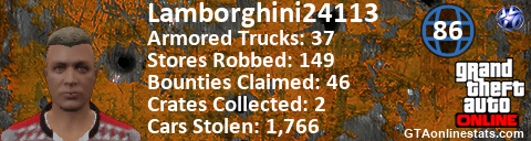 <a href="http://GTAonlinestats.com/showplayer/Lamborghini24113"><img src="http://GTAonlinestats.com/signature/Lamborghini24113/sig.png" alt="lamborghini24113" border="0" /></a>