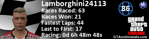 <a href="http://GTAonlinestats.com/showplayer/Lamborghini24113"><img src="http://GTAonlinestats.com/racesignature/Lamborghini24113/sig.png" alt="lamborghini24113" border="0" /></a>
