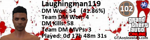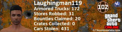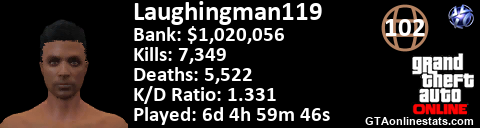 [URL=http://GTAonlinestats.com/showplayer/Laughingman119/2][IMG]http://GTAonlinestats.com/signature/Laughingman119/2/sig.png[/IMG][/URL]