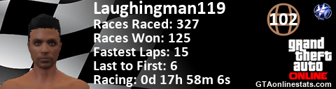 [URL=http://GTAonlinestats.com/showplayer/Laughingman119/2][IMG]http://GTAonlinestats.com/racesignature/Laughingman119/2/sig.png[/IMG][/URL]