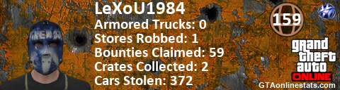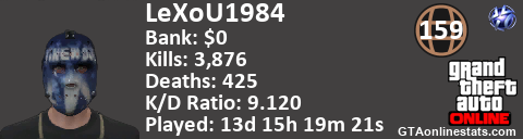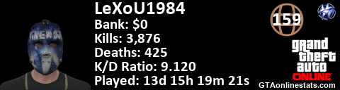 <a href="http://GTAonlinestats.com/showplayer/LeXoU1984"><img src="http://GTAonlinestats.com/randomsignature/LeXoU1984/sig.png" alt="LeXoU1984" border="0" /></a>