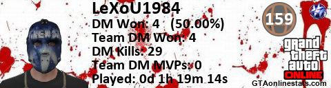 [URL=http://GTAonlinestats.com/showplayer/LeXoU1984][IMG]http://GTAonlinestats.com/dmsignature/LeXoU1984/sig.png[/IMG][/URL]