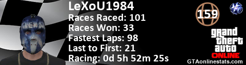 [URL=http://GTAonlinestats.com/showplayer/LeXoU1984][IMG]http://GTAonlinestats.com/racesignature/LeXoU1984/sig.png[/IMG][/URL]
