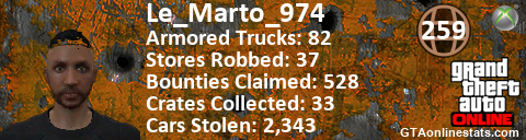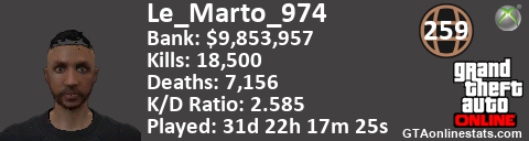 <a href="http://GTAonlinestats.com/showplayer/Le_Marto_974"><img src="http://GTAonlinestats.com/randomsignature/Le_Marto_974/sig.png" alt="Le_Marto_974" border="0" /></a>