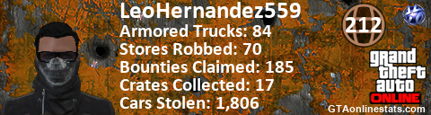 [URL=http://GTAonlinestats.com/showplayer/LeoHernandez559][IMG]http://GTAonlinestats.com/crimesignature/LeoHernandez559/sig.png[/IMG][/URL]