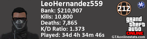 [URL=http://GTAonlinestats.com/showplayer/LeoHernandez559][IMG]http://GTAonlinestats.com/signature/LeoHernandez559/sig.png[/IMG][/URL]