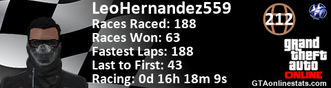 [URL=http://GTAonlinestats.com/showplayer/LeoHernandez559][IMG]http://GTAonlinestats.com/racesignature/LeoHernandez559/sig.png[/IMG][/URL]