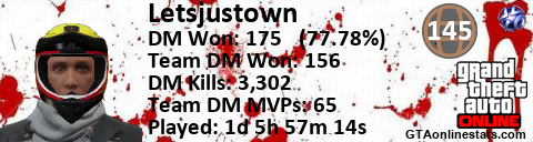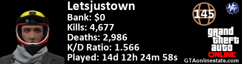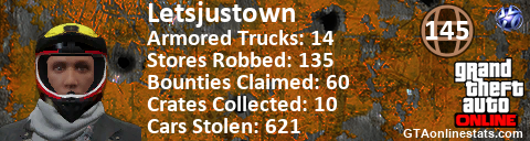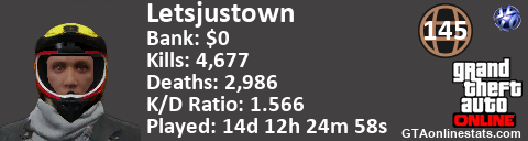 [URL=http://GTAonlinestats.com/showplayer/Letsjustown][IMG]http://GTAonlinestats.com/signature/Letsjustown/sig.png[/IMG][/URL]