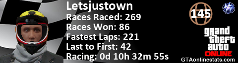 [URL=http://GTAonlinestats.com/showplayer/Letsjustown][IMG]http://GTAonlinestats.com/racesignature/Letsjustown/sig.png[/IMG][/URL]