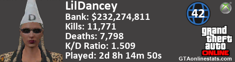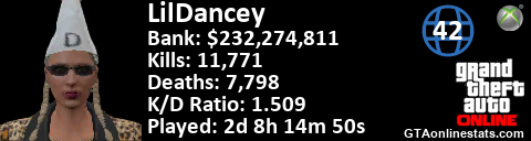 <a href="http://GTAonlinestats.com/showplayer/LilDancey/2"><img src="http://GTAonlinestats.com/signature/LilDancey/2/sig.png" alt="LilDancey" border="0" /></a>