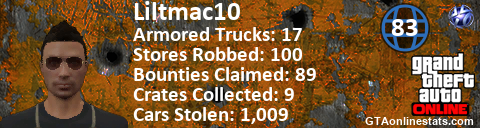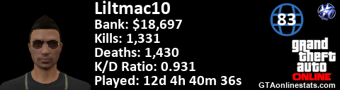 <a href="http://GTAonlinestats.com/showplayer/Liltmac10"><img src="http://GTAonlinestats.com/signature/Liltmac10/sig.png" alt="Liltmac10" border="0" /></a>