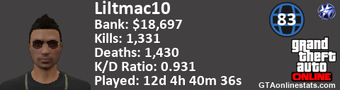 <a href="http://GTAonlinestats.com/showplayer/Liltmac10"><img src="http://GTAonlinestats.com/randomsignature/Liltmac10/sig.png" alt="Liltmac10" border="0" /></a>