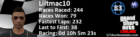 <a href="http://GTAonlinestats.com/showplayer/Liltmac10"><img src="http://GTAonlinestats.com/racesignature/Liltmac10/sig.png" alt="Liltmac10" border="0" /></a>