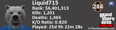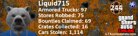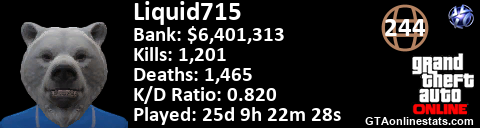 <a href="http://GTAonlinestats.com/showplayer/Liquid715"><img src="http://GTAonlinestats.com/signature/Liquid715/sig.png" alt="Liquid715" border="0" /></a>
