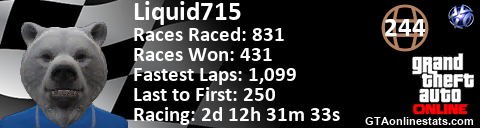 <a href="http://GTAonlinestats.com/showplayer/Liquid715"><img src="http://GTAonlinestats.com/racesignature/Liquid715/sig.png" alt="Liquid715" border="0" /></a>