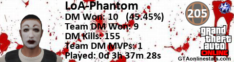 <a href="http://GTAonlinestats.com/showplayer/LoA-Phantom"><img src="http://GTAonlinestats.com/dmsignature/LoA-Phantom/sig.png" alt="LoA-Phantom" border="0" /></a>