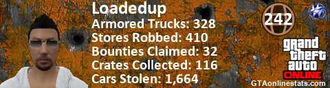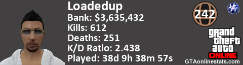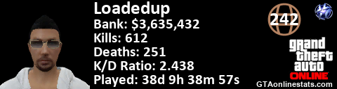 [URL=http://GTAonlinestats.com/showplayer/Loadedup][IMG]http://GTAonlinestats.com/greysignature/Loadedup/sig.png[/IMG][/URL]