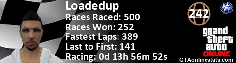 [URL=http://GTAonlinestats.com/showplayer/Loadedup][IMG]http://GTAonlinestats.com/racesignature/Loadedup/sig.png[/IMG][/URL]