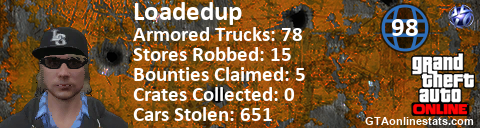 [URL=http://GTAonlinestats.com/showplayer/Loadedup/2][IMG]http://GTAonlinestats.com/crimesignature/Loadedup/2/sig.png[/IMG][/URL]