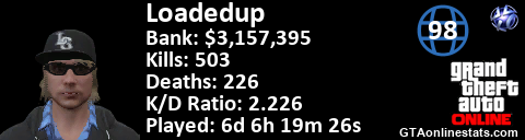 [URL=http://GTAonlinestats.com/showplayer/Loadedup/2][IMG]http://GTAonlinestats.com/signature/Loadedup/2/sig.png[/IMG][/URL]