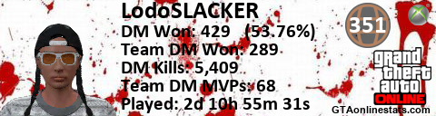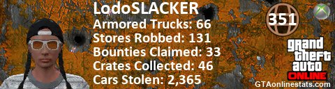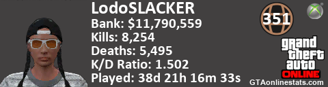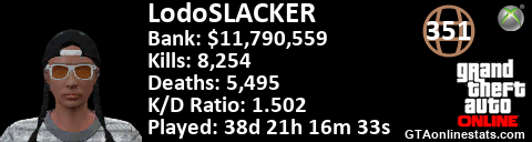 [URL=http://GTAonlinestats.com/showplayer/LodoSLACKER][IMG]http://GTAonlinestats.com/dmsignature/LodoSLACKER/sig.png[/IMG][/URL]