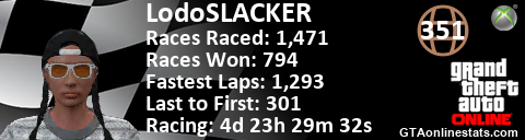 [URL=http://GTAonlinestats.com/showplayer/LodoSLACKER][IMG]http://GTAonlinestats.com/racesignature/LodoSLACKER/sig.png[/IMG][/URL]