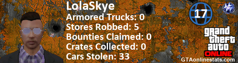 [URL=http://GTAonlinestats.com/showplayer/LolaSkye/2][IMG]http://GTAonlinestats.com/crimesignature/LolaSkye/2/sig.png[/IMG][/URL]