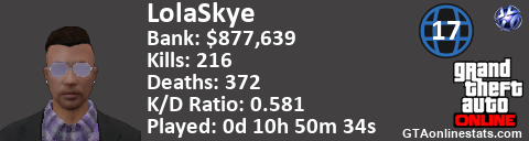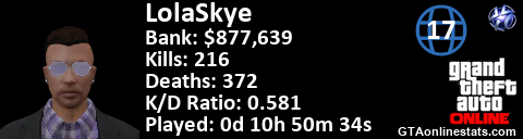 [URL=http://GTAonlinestats.com/showplayer/LolaSkye/2][IMG]http://GTAonlinestats.com/signature/LolaSkye/2/sig.png[/IMG][/URL]