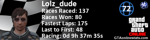 [URL=http://GTAonlinestats.com/showplayer/Lolz_dude][IMG]http://GTAonlinestats.com/racesignature/Lolz_dude/sig.png[/IMG][/URL]