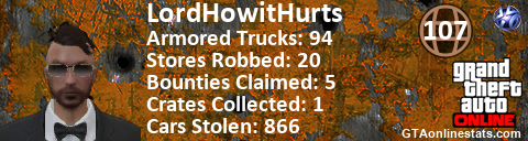 [URL=http://GTAonlinestats.com/showplayer/LordHowitHurts][IMG]http://GTAonlinestats.com/crimesignature/LordHowitHurts/sig.png[/IMG][/URL]