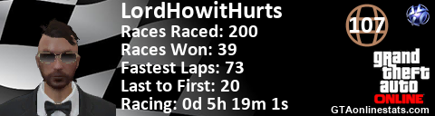 <a href="http://GTAonlinestats.com/showplayer/LordHowitHurts"><img src="http://GTAonlinestats.com/racesignature/LordHowitHurts/sig.png" alt="LordHowitHurts" border="0" /></a>