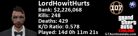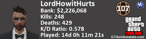 <a href="http://GTAonlinestats.com/showplayer/LordHowitHurts"><img src="http://GTAonlinestats.com/dmsignature/LordHowitHurts/sig.png" alt="LordHowitHurts" border="0" /></a>