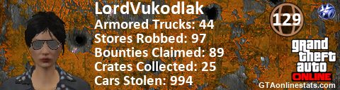[URL=http://GTAonlinestats.com/showplayer/LordVukodlak][IMG]http://GTAonlinestats.com/crimesignature/LordVukodlak/sig.png[/IMG][/URL]