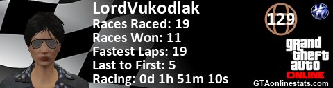 <a href="http://GTAonlinestats.com/showplayer/LordVukodlak"><img src="http://GTAonlinestats.com/racesignature/LordVukodlak/sig.png" alt="LordVukodlak" border="0" /></a>