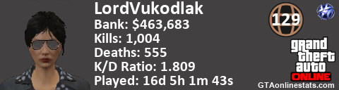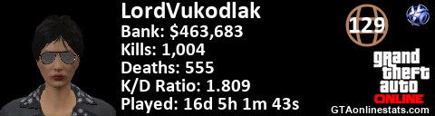 <a href="http://GTAonlinestats.com/showplayer/LordVukodlak"><img src="http://GTAonlinestats.com/signature/LordVukodlak/sig.png" alt="LordVukodlak" border="0" /></a>
