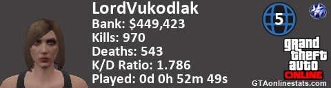 <a href="http://GTAonlinestats.com/showplayer/LordVukodlak/3"><img src="http://GTAonlinestats.com/dmsignature/LordVukodlak/3/sig.png" alt="LordVukodlak" border="0" /></a>