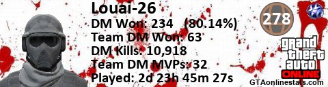[URL=http://GTAonlinestats.com/showplayer/Louai-26][IMG]http://GTAonlinestats.com/dmsignature/Louai-26/sig.png[/IMG][/URL]