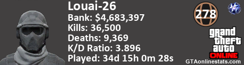 <a href="http://GTAonlinestats.com/showplayer/Louai-26"><img src="http://GTAonlinestats.com/randomsignature/Louai-26/sig.png" alt="Louai-26" border="0" /></a>