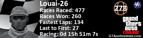 [URL=http://GTAonlinestats.com/showplayer/Louai-26][IMG]http://GTAonlinestats.com/racesignature/Louai-26/sig.png[/IMG][/URL]