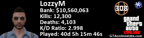 <a href="http://GTAonlinestats.com/showplayer/LozzyM"><img src="http://GTAonlinestats.com/randomsignature/LozzyM/sig.png" alt="LozzyM" border="0" /></a>